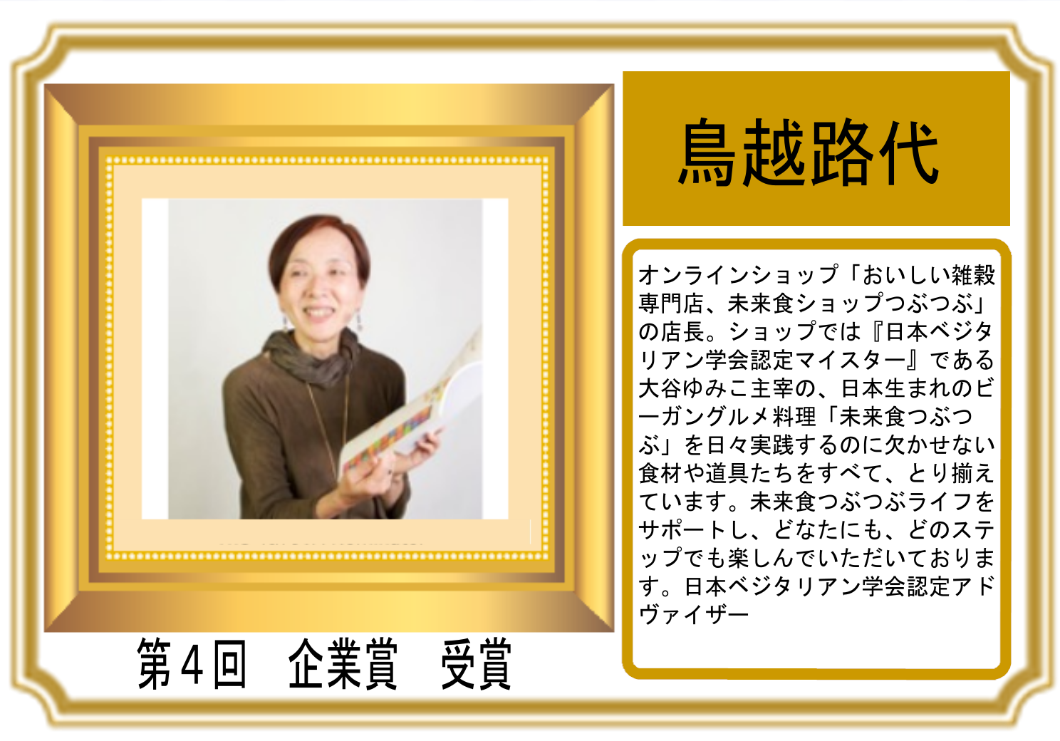 第4回 日本ベジタリアンアワード 企業賞 受賞:未来食ショップつぶつぶ 鳥越路代様